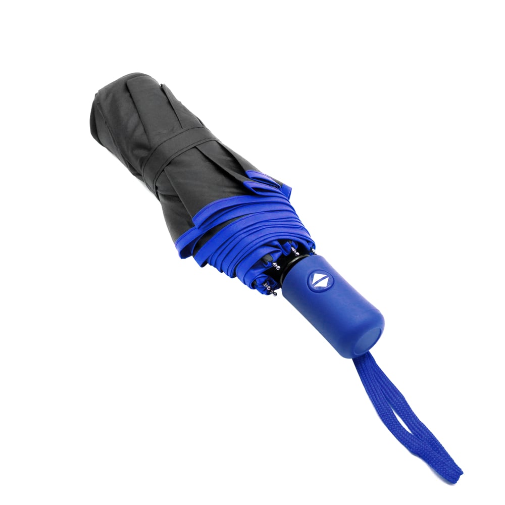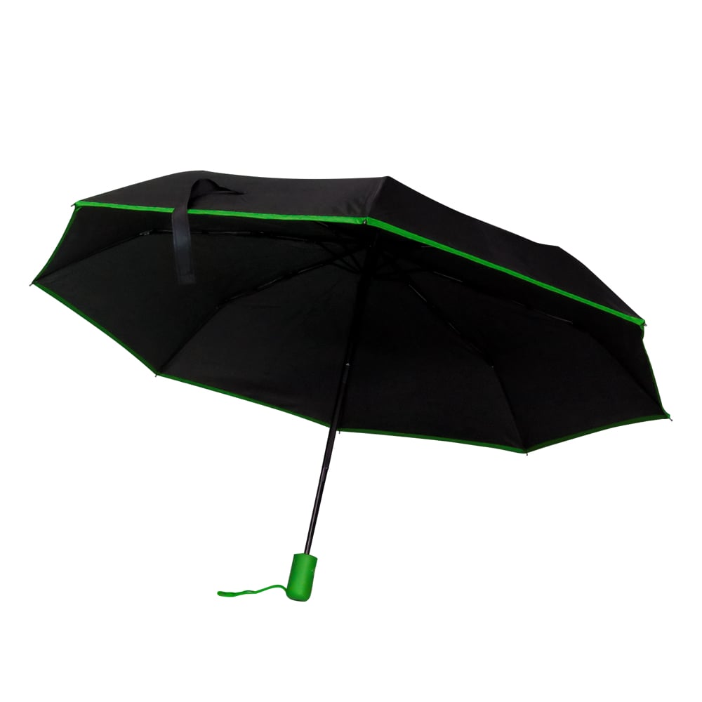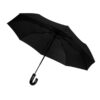 Противоштормовой автоматический зонт Line выполнен из ткани эпонж 190T. На таком материале вода превращается в капельки и скатывается, а сам зонт остается сухим. Черный металлический каркас с ветрозащитной функцией. Спицы из стекловолокна, а специальное устройство препятствует поломке спиц при резких порывах ветра. Ручка софтач – в тон строчке по краю зонта.