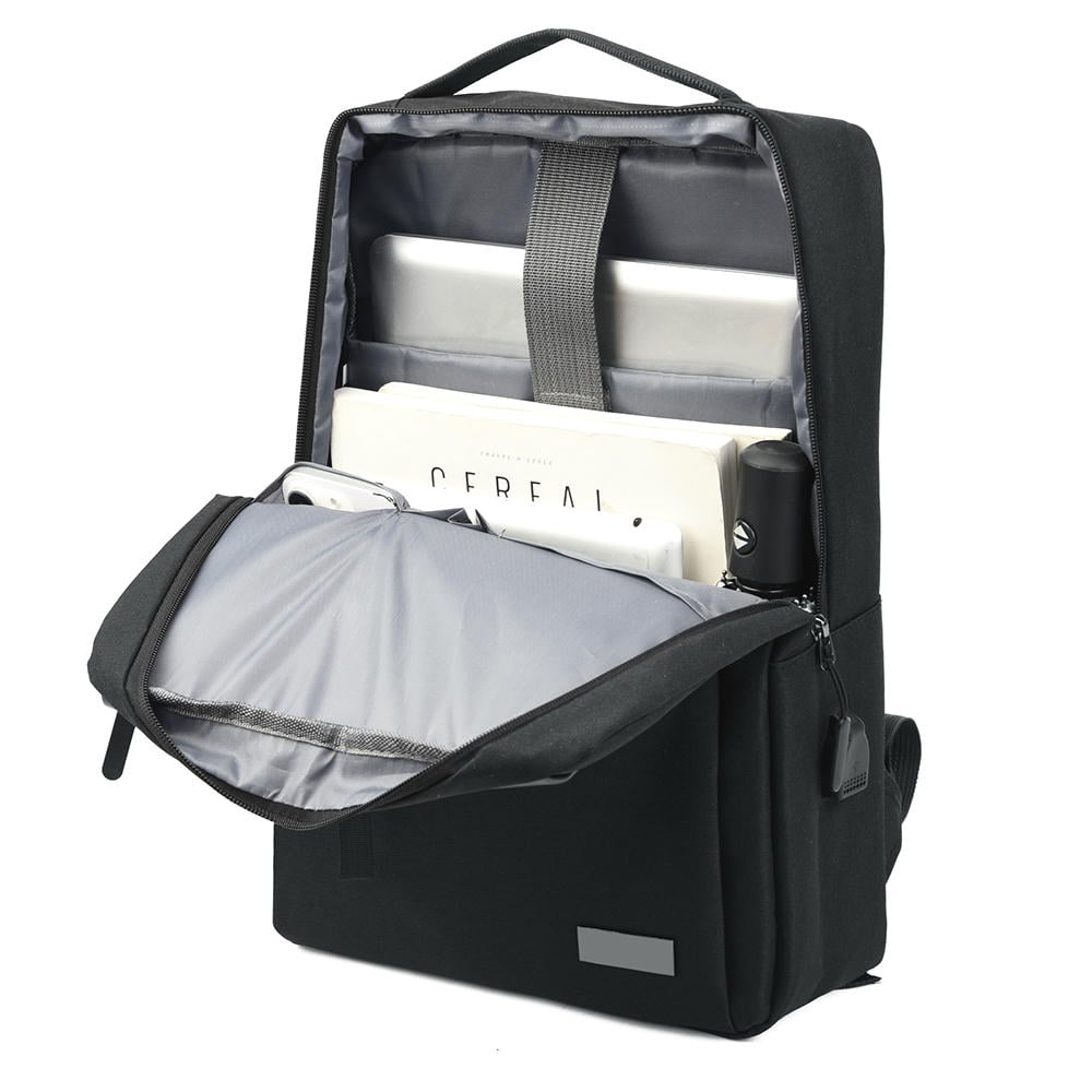Одно большое отделение закрывается молнией со скрытым звеном. Внутри большой уплотнённый карман для ноутбука 15,6 дюймов с клапаном на велькро и карман-органайзер для мелких аксессуаров.