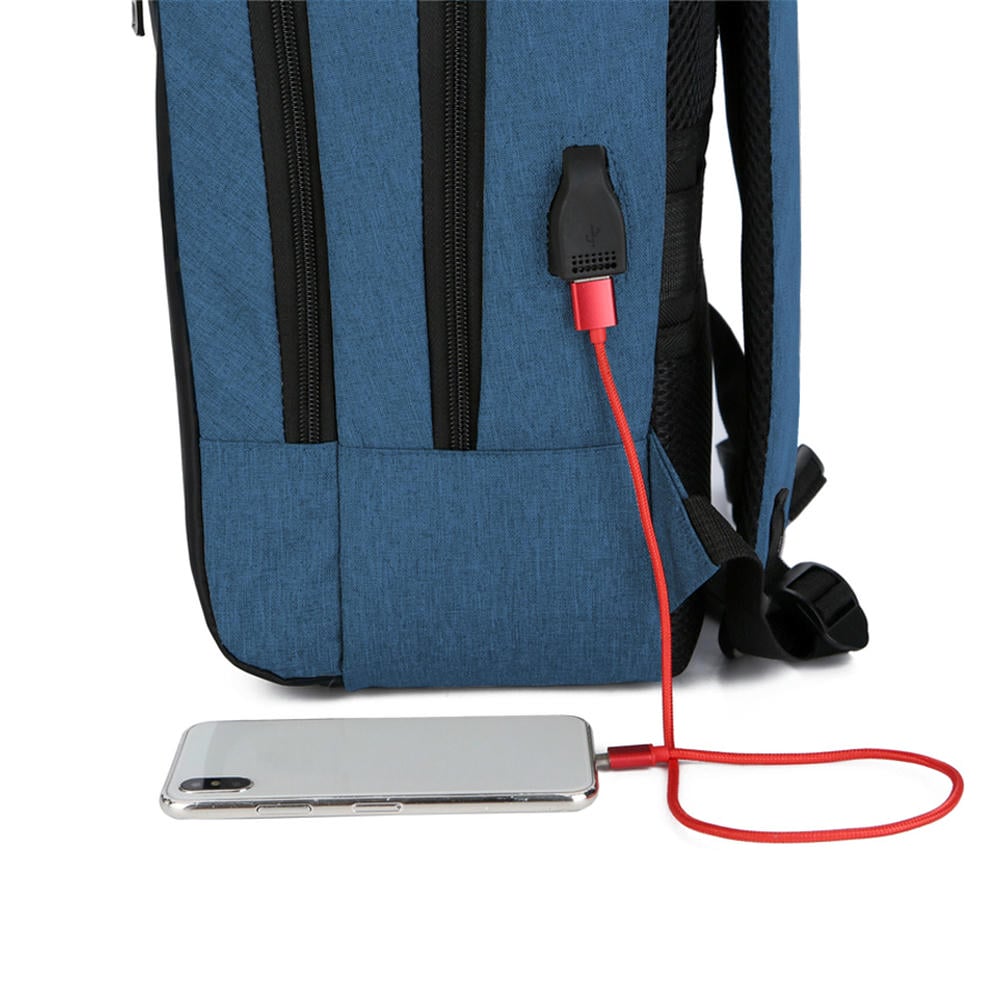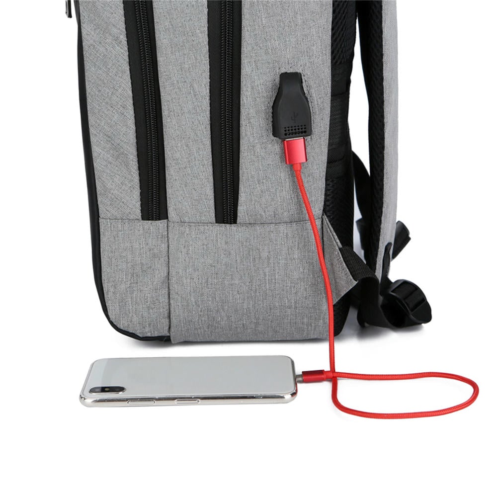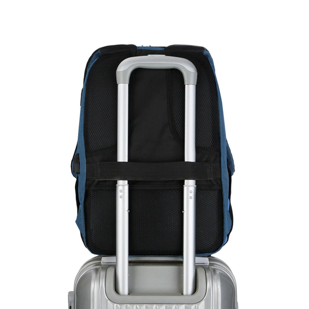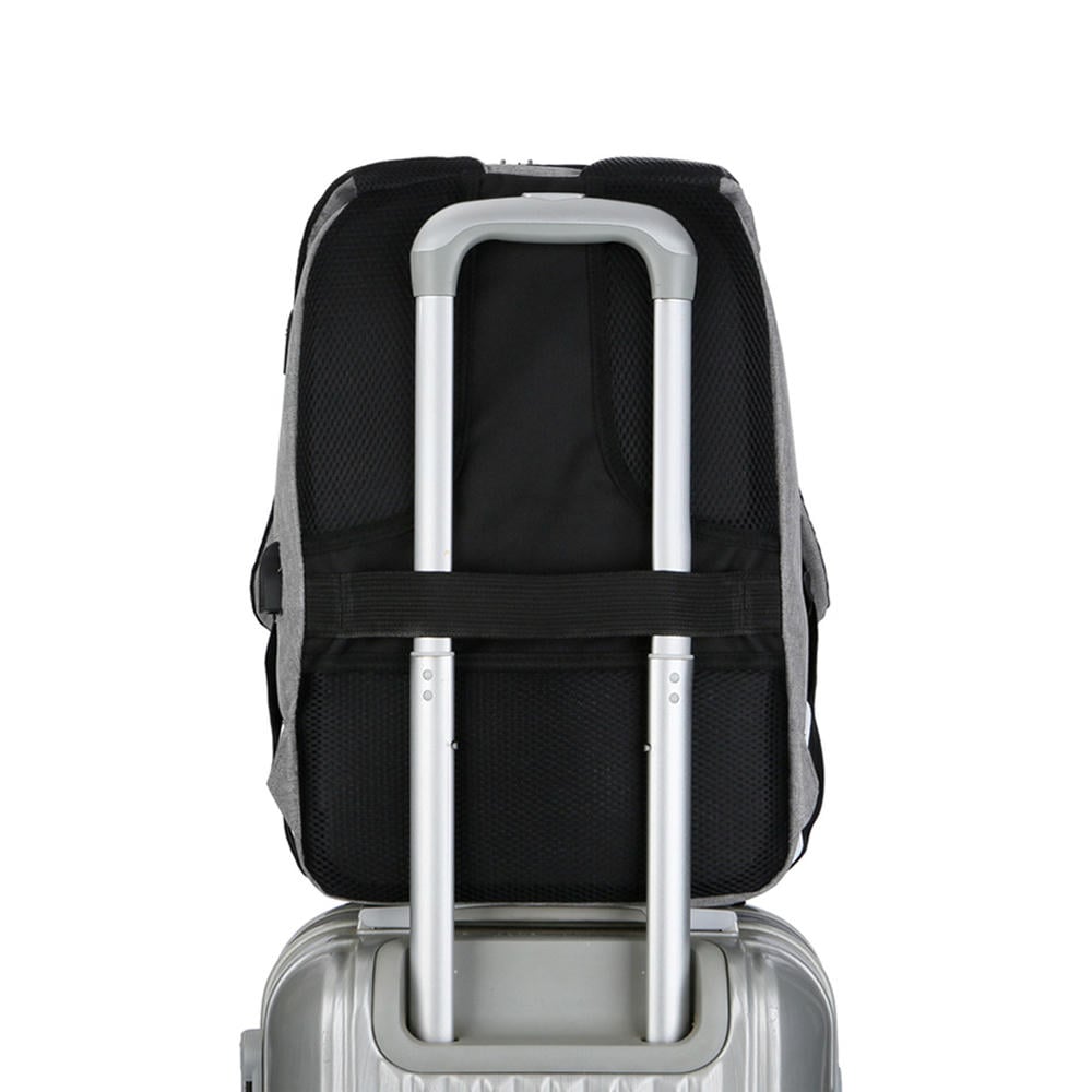 Сбоку USB-разъём с проводом для подключения внешнего аккумулятора и накладка с прорезью для наушников. 3D-сетка на подкладке плечевых ремней и накладка задней стенки предотвращает скольжение и обеспечивает дополнительную вентиляцию и комфорт при контакте с кожей и одеждой. Двойное уплотнение анатомических накладок на задней стенке распределяет вес рюкзака и снижает нагрузку на позвоночник. Специальная накладка для чемодана на задней стенке делает этот рюкзак незаменимым спутником для путешествий. Уплотнённые плечевые ремни регулируются по длине и имеют один небольшой дополнительный открытый карман для карт, ключей и прочих мелочей.
