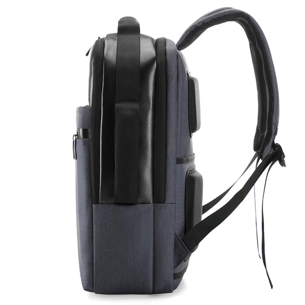Его особенности — сочетание материалов двух фактур в этом уплотнённом со всех сторон рюкзаке с двумя отделениями, короткие ручки с двух сторон, а также множество карманов для различных мелочей делают этот супер-комфортный рюкзак идеальным спутником для города и путешествий. Верх рюкзака и часть передней стенки из высококачественной искусственной кожи надёжно защищают содержимое от попадания внутрь влаги. Два отделения закрываются на молнии со скрытым звеном. Внутри заднего отделения уплотнённый карман для ноутбука 15,6 дюймов и карман для планшета 10 дюймов с клапаном-резинкой на велькро.
